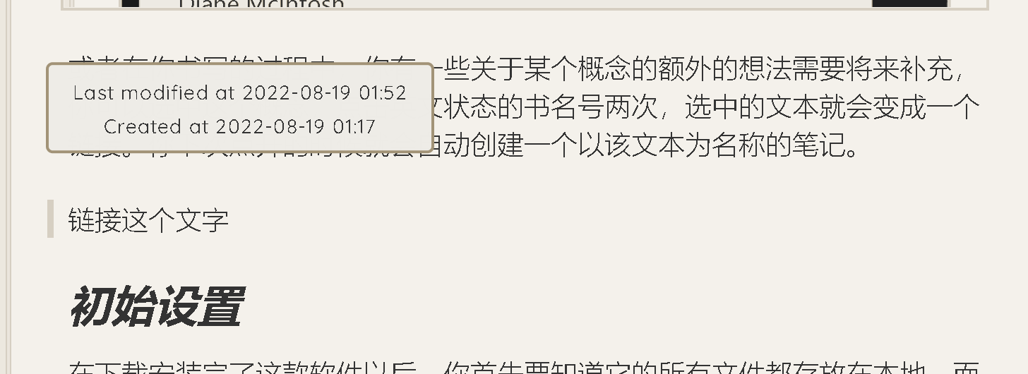 或者在你书写的过程中,你有一些关于某个概念的额外的想法需要将来补充,你可以选中这个概念,点击英文状态的书名号两次,选中的文本就会变成一个链接。你下次点开的时候就会自动创建一个以该文本为名称的笔记,如下图。